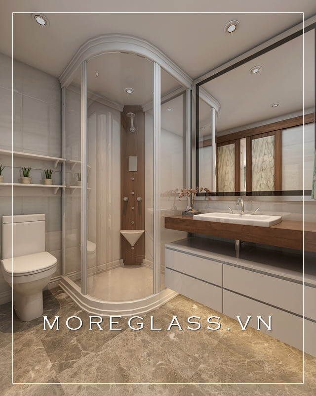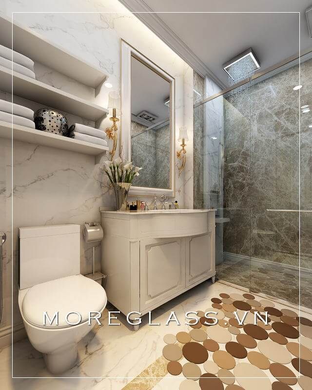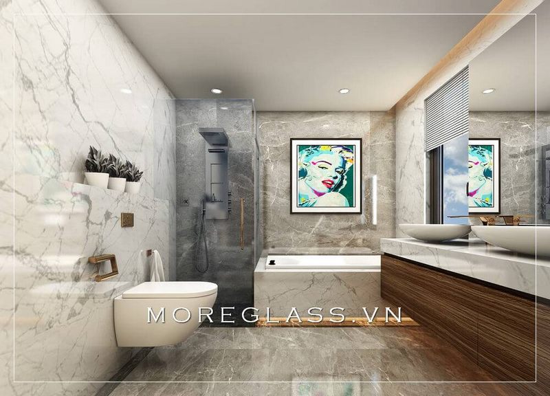 Sử dụng đá tự nhiên cao cấp, ốp nền và tường kết hợp với vách kính tắm cường lực, chúng tôi sẽ tạo ra một không gian hoàn hảo trong từng chi tiết cho mẫu thiết kế phòng tắm đẹp của bạn và phân cách hai không gian nhà vệ sinh và phòng tắm.