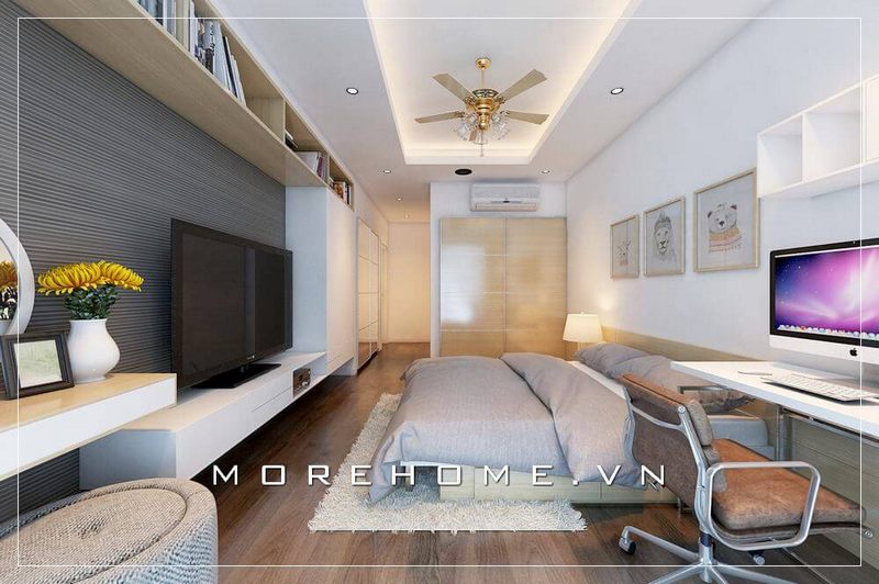 Để tạo ra một không gian sống hiện đại và khoa học cho phòng ngủ của bố mẹ trong căn hộ chung cư nhỏ, có thể sử dụng các giải pháp như: kệ ti vi treo tường, tủ quần áo cửa lùa, giường ngủ thông minh... để tối ưu không gian sử dụng.