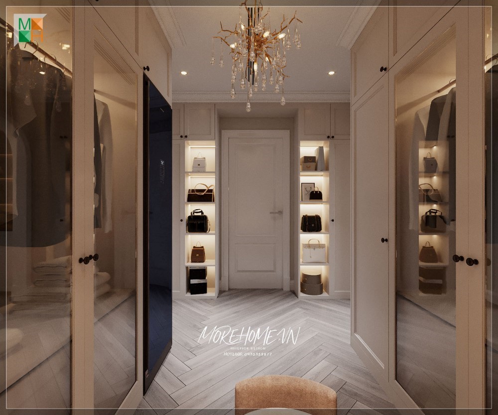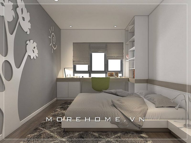 Phòng ngủ của bé trai được trang bị nội thất hiện đại, màu trắng làm nổi bật, sàn gỗ màu nâu giúp tạo nên một không gian ấm áp và nhẹ nhàng hơn.