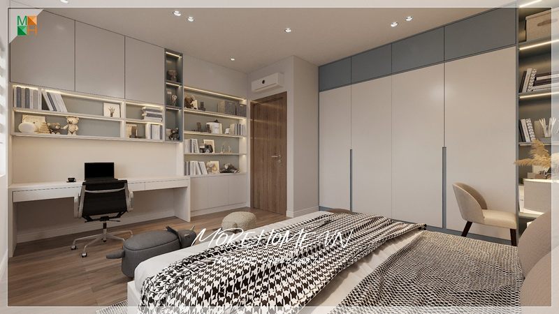 Lựa chọn thiết kế không gian phòng ngủ hiện đại với các kệ tủ âm tường giúp gia chủ tiết kiệm diện tích không gian và cung cấp nơi trưng bày sách và đồ của họ rất tiện lợi.