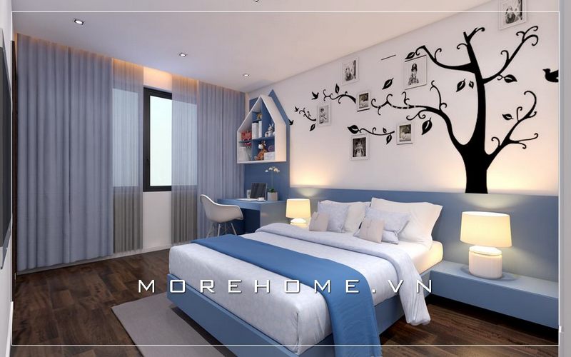 Phòng ngủ trẻ em hiện đại được thiết kế với một chiếc giường ngủ gỗ màu xanh tiện dụng, tạo nên điểm nhấn cho cả căn phòng.
